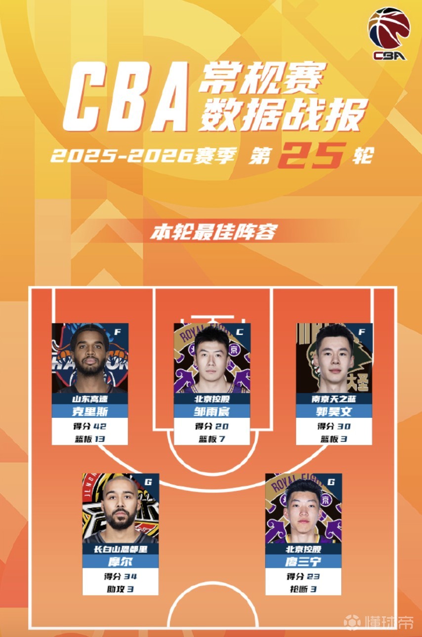 CBA第25轮最佳阵:克里斯、邹雨宸、郭昊文、摩尔、廖三宁入选