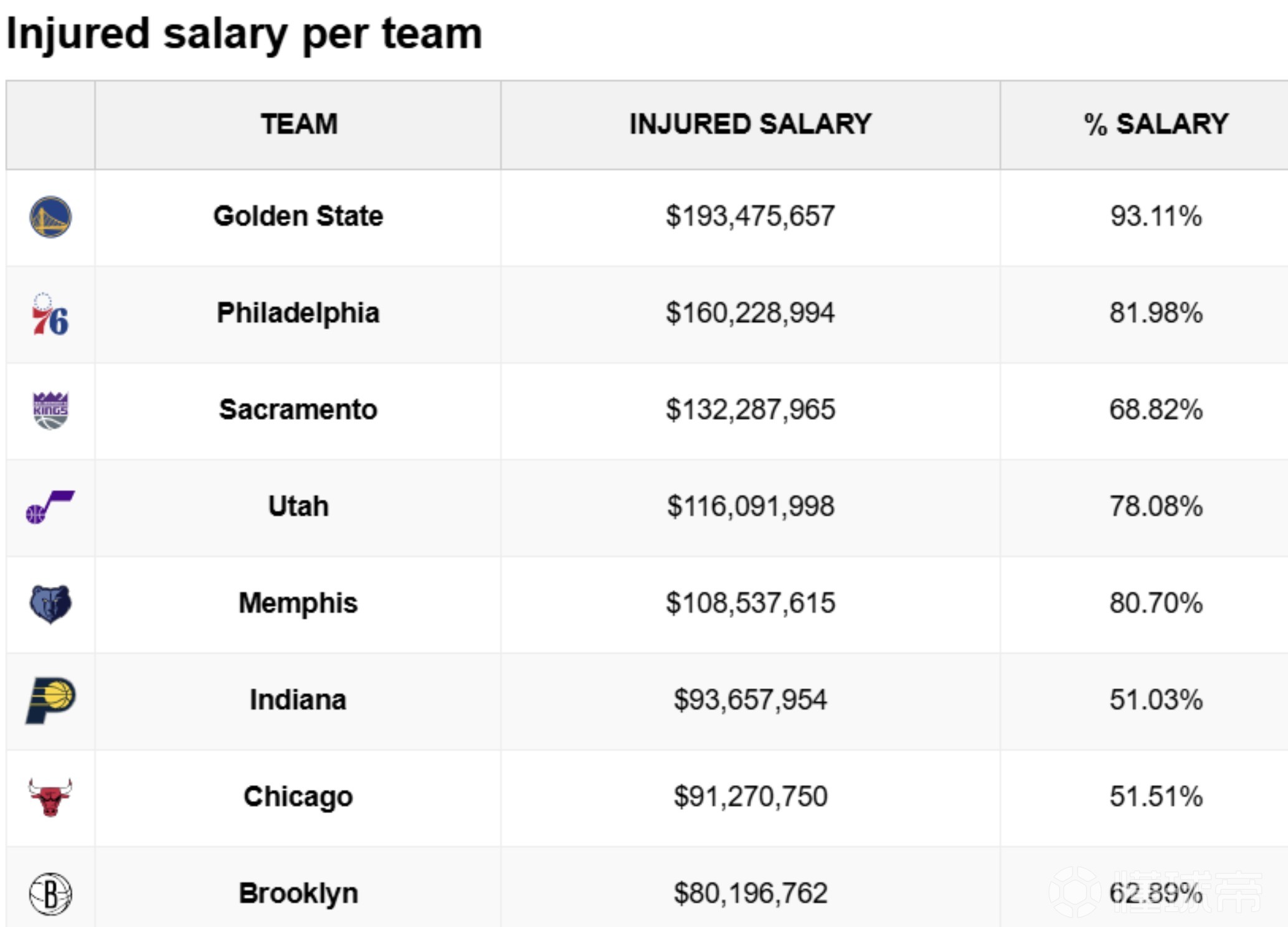 费城76人:伤病薪资 $160228994,占总薪资比例 81.98%