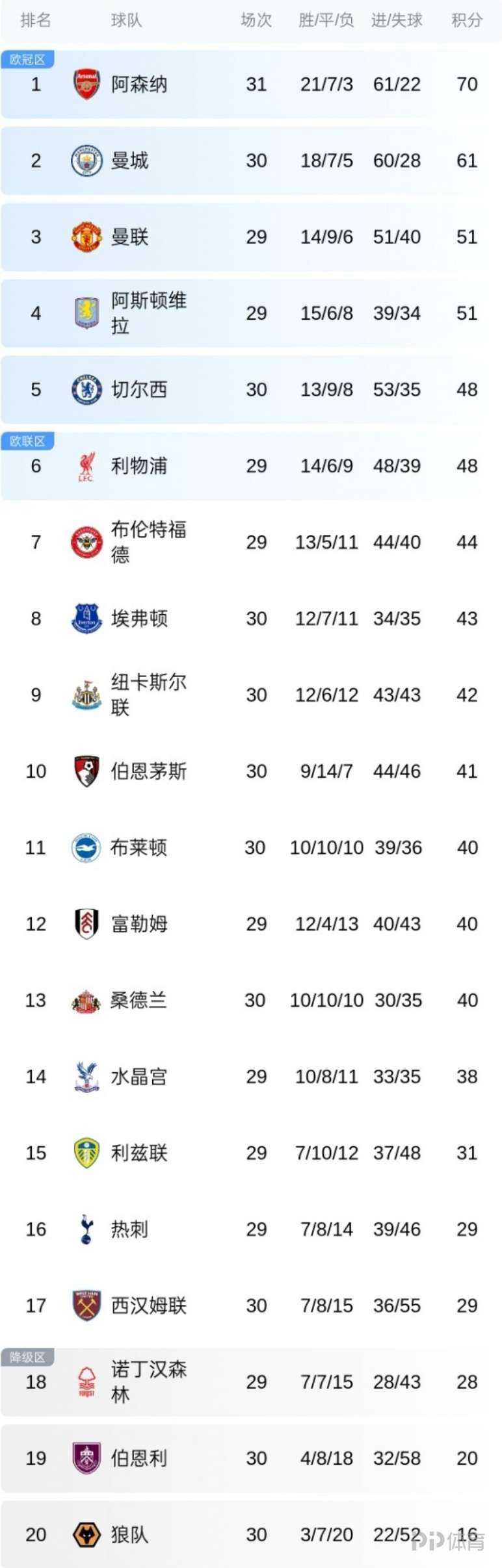 英超积分榜:阿森纳多赛9分领跑 曼城遭遇联赛两连平